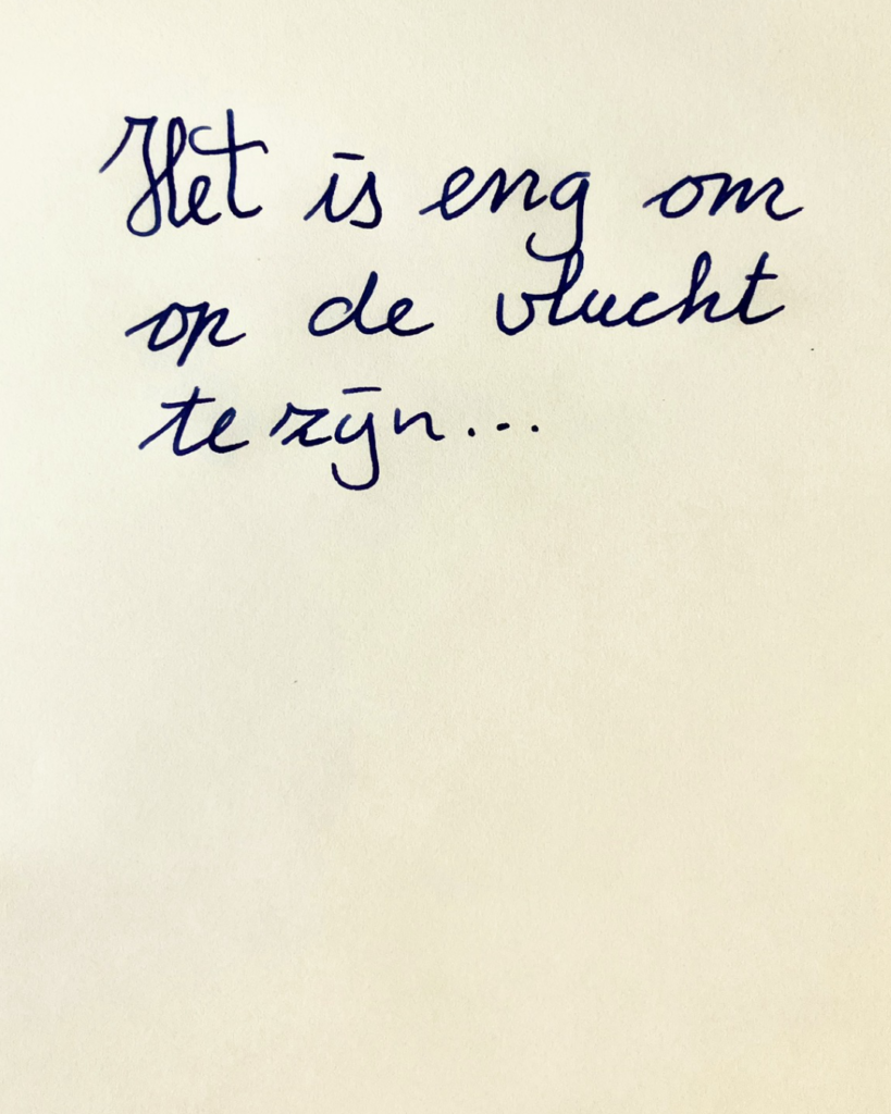 Ik wil op zijn schouder mijn tranen laten. Mij volledig laten dragen. Eén omhelzing die meer is dan een omhelzing tussen twee mannen op de vlucht. De wereld laten breken. En niemand zijn. Zonder geschiedenis. Misschien nog wel het liefst zonder andere mensen. Zonder begrijpende blikken. Wat een armoede zo te leven.